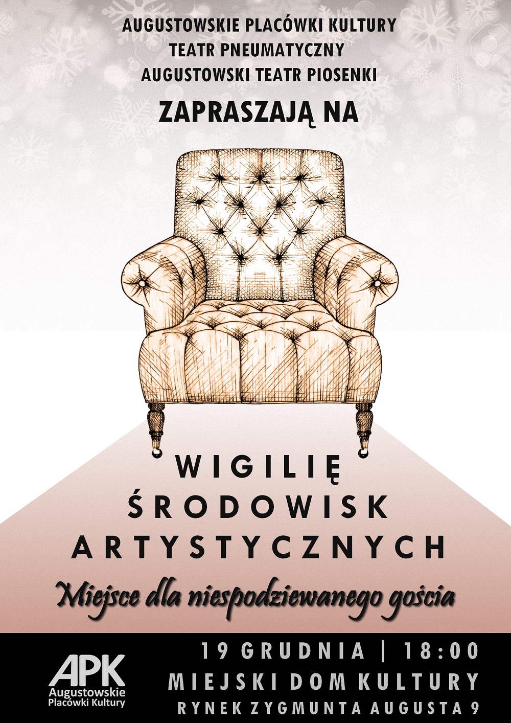 Augustowskie Placówki Kultury, Teatr Pneumatyczny oraz Augustowski Teatr Piosenki mają przyjemność zaprosić wszystkich augustowskich Twórców na "Miejsce dla niespodziewanego gościa", czyli WIGILIĘ ŚRODOWISK ARTYSTYCZNYCH! Pragniemy, aby to radosne przedświąteczne spotkanie wspierało integrację artystycznej społeczności Augustowa.