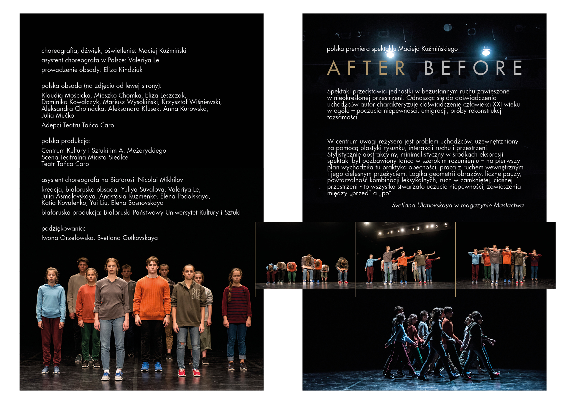 Spektakl After Before przedstawia jednostki w bezustannym ruchu zawieszone w nieokreślonej przestrzeni. Odnosząc się do doświadczenia uchodźców autor charakteryzuje doświadczenia człowieka XXI wieku w ogóle - poczucia niepewności, emigracji, próby rekonstrukcji tożsamości.