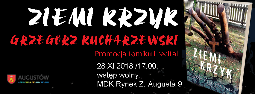 Serdecznie zapraszamy na promocję tomiku poezji pt. „Ziemi krzyk” i recital Grzegorza Kucharzewskiego. Wydarzenie odbędzie się 28 listopada 2018, o godzinie 17.00 w Miejskim Domu Kultury , Rynek Zygmunta Augusta 9. Wstęp wolny.