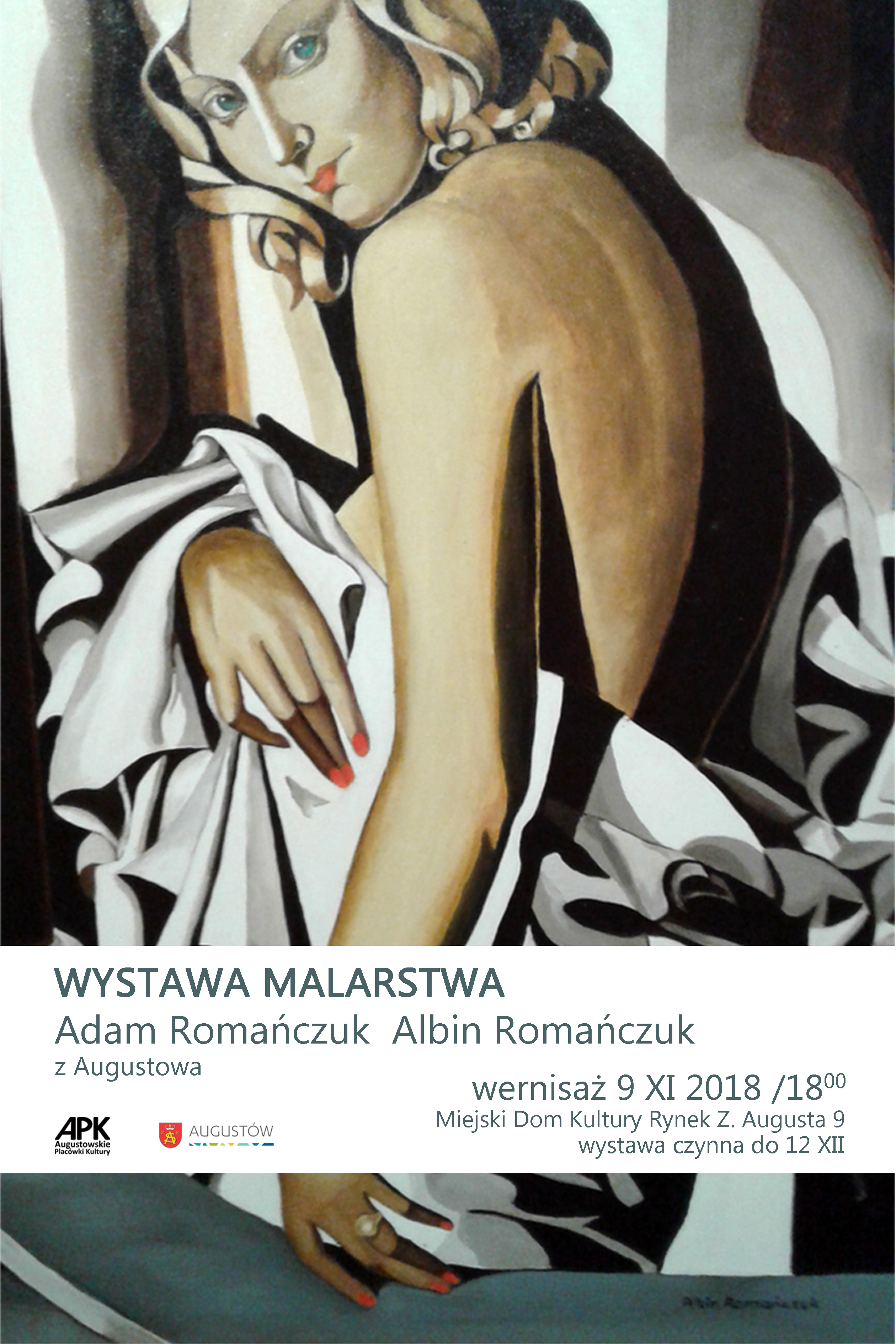 Zapraszamy na wystawę prac malarskich tym razem braci rodem z Augustowa Albina i Adama Romańczuków. Prezentowanych będzie ponad 20 obrazów malowanych techniką olejną. Znajdziemy na nich sceny polowań, kuligów, pejzaży a także portrety. Panowie malują od dawna ale dopiero teraz postanowili zaprezentować swój dorobek malarski. Zapraszamy do Małej Galerii Augustowskich Placówek Kultury 9 listopada na godz.18.00 na uroczyste otwarcie wystawy z udziałem autorów, /Rynek Z. Augusta 9/
